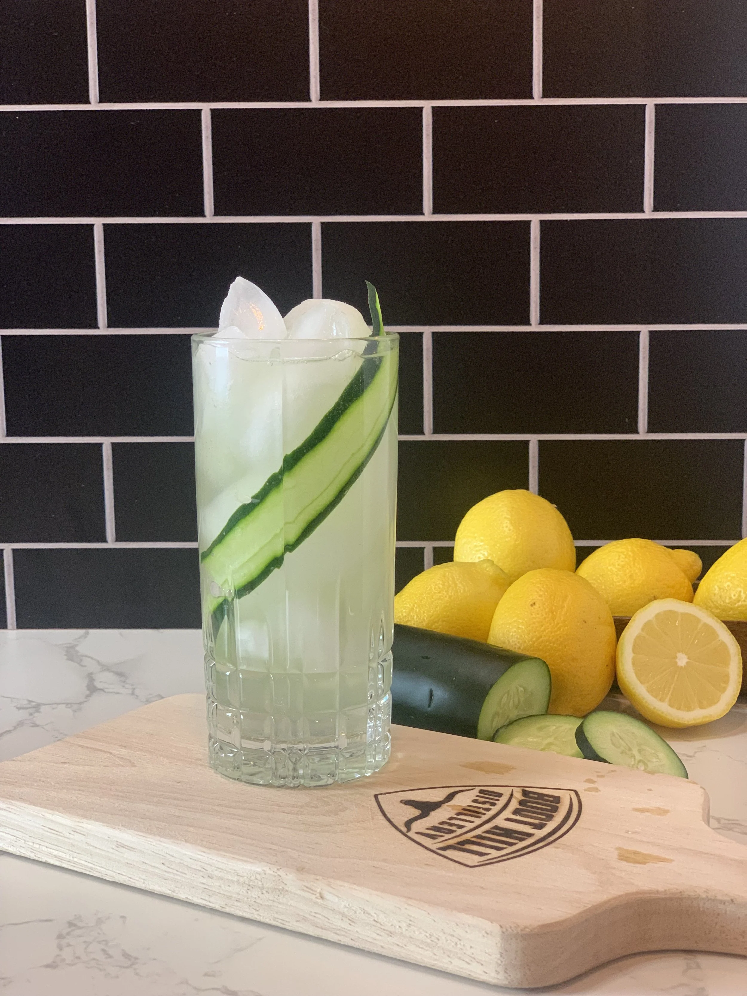 Line a collins glass with a cucumber ribbon and fill with ice.